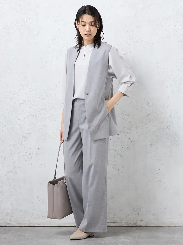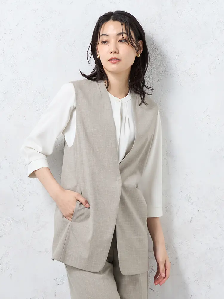 トレンドのレイヤードスタイルが叶うミドル丈のノーカラージレ。