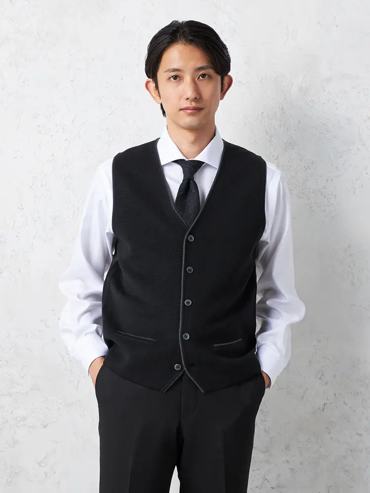 静電気の発生や毛羽立ちを抑えてくれる、アンチピリングと静電気対策を備えたニットベストです。