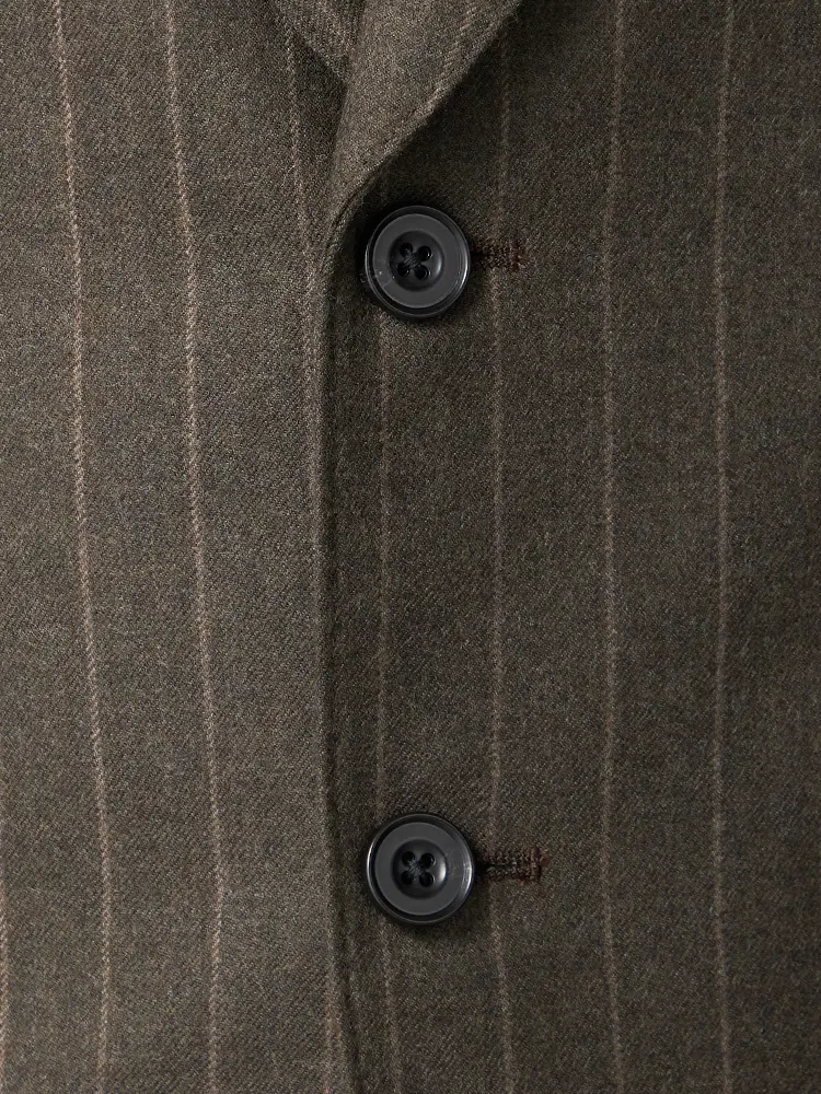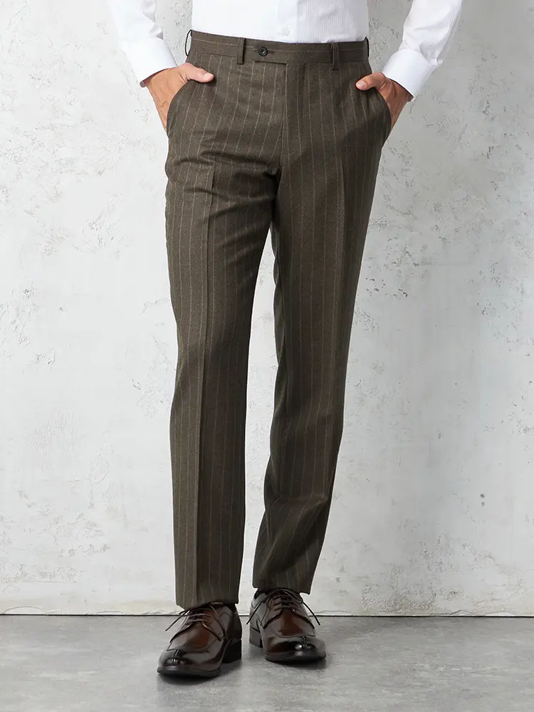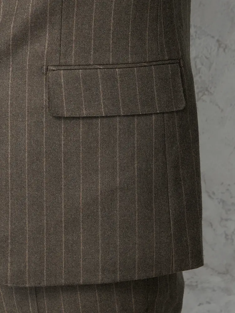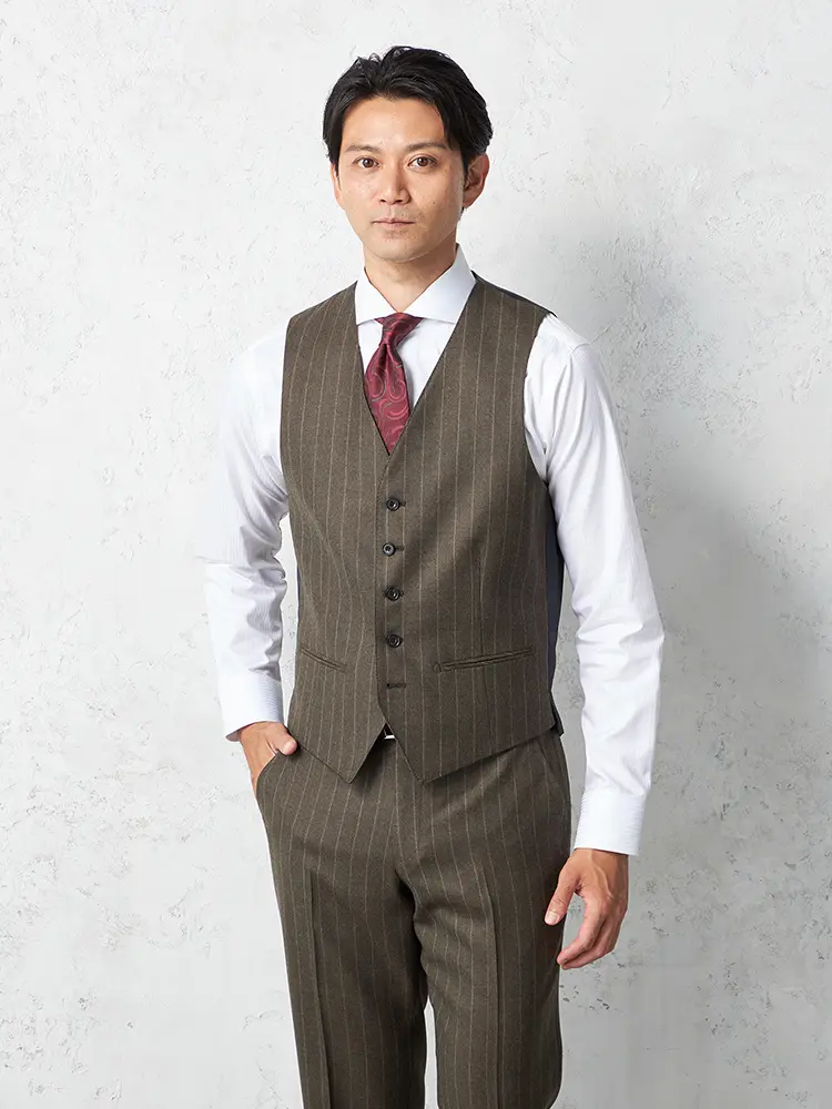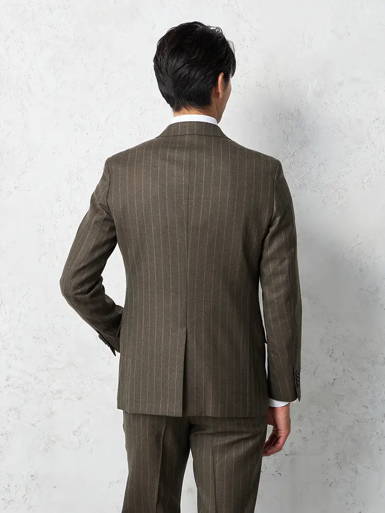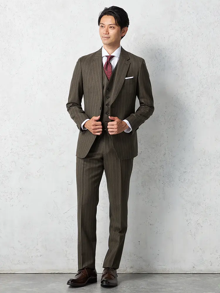 ストライプ柄を優しい雰囲気でまとめたセンターベントのノータックスリーピーススーツ。