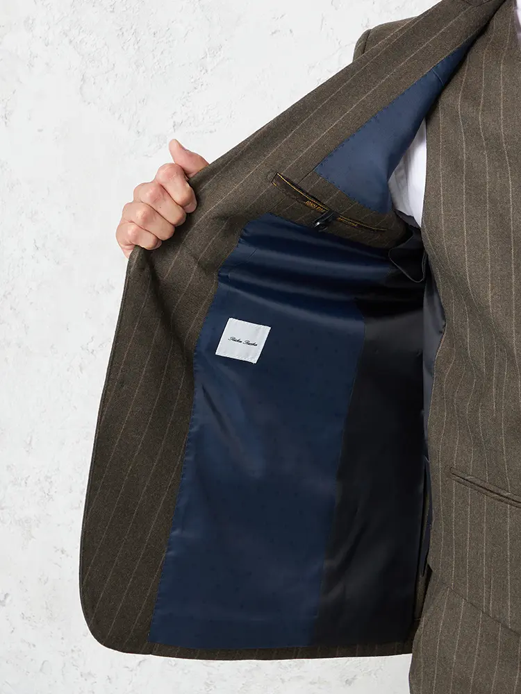 ドットをデザインした背抜きの裏地や台場仕立ての内ポケットなど、見えない部分にもこだわった贅沢な仕上がりです。