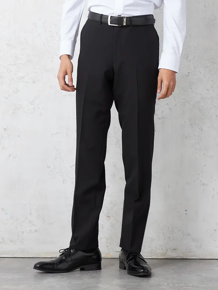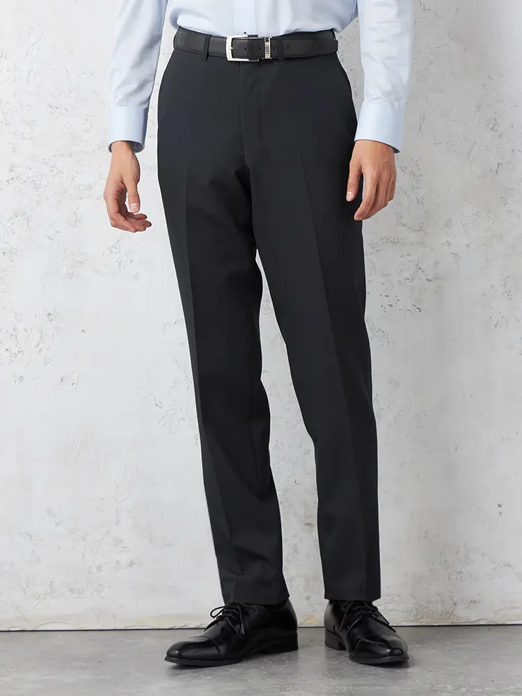 スリムに見せつつも窮屈すぎないノータックのパンツは、着る人を選ばない万能な一着。