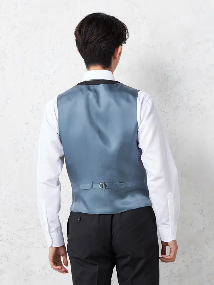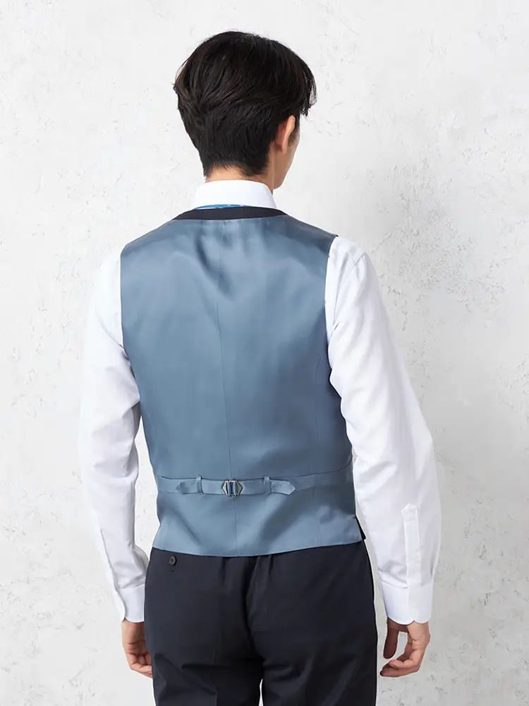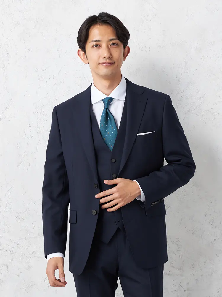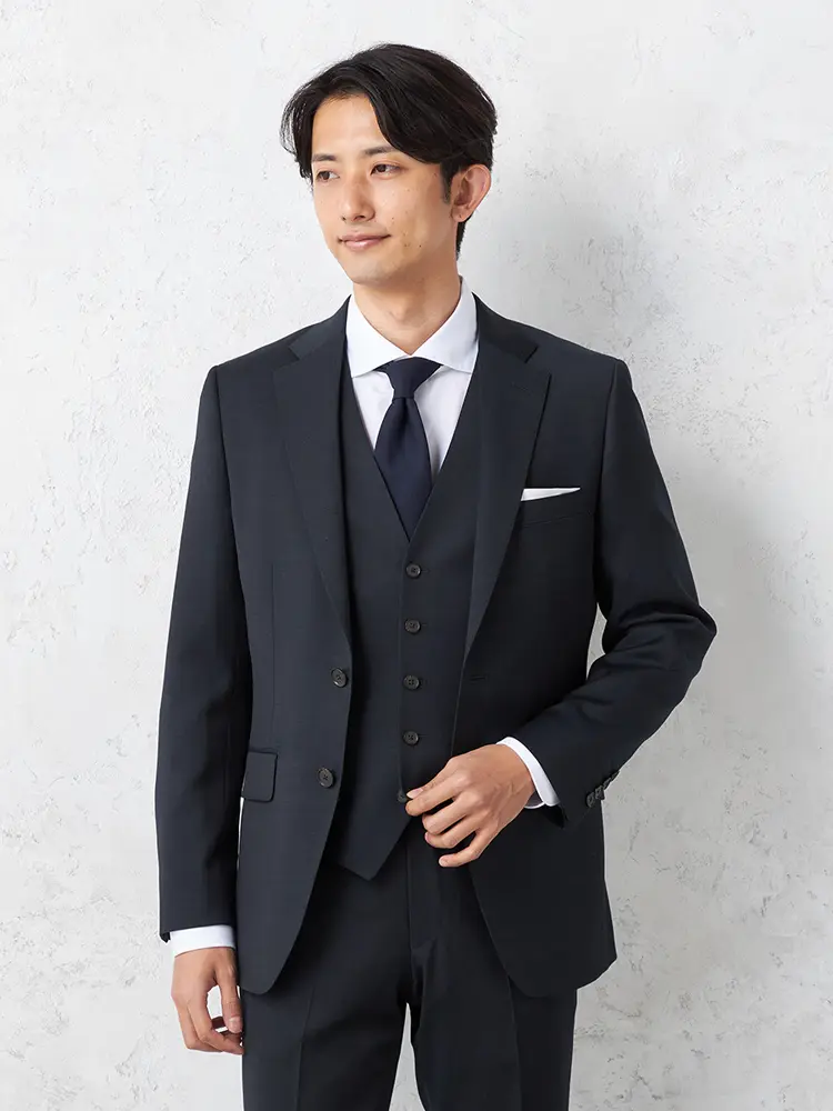 軽やかなポリエステル×ウールの3ピーススーツ。