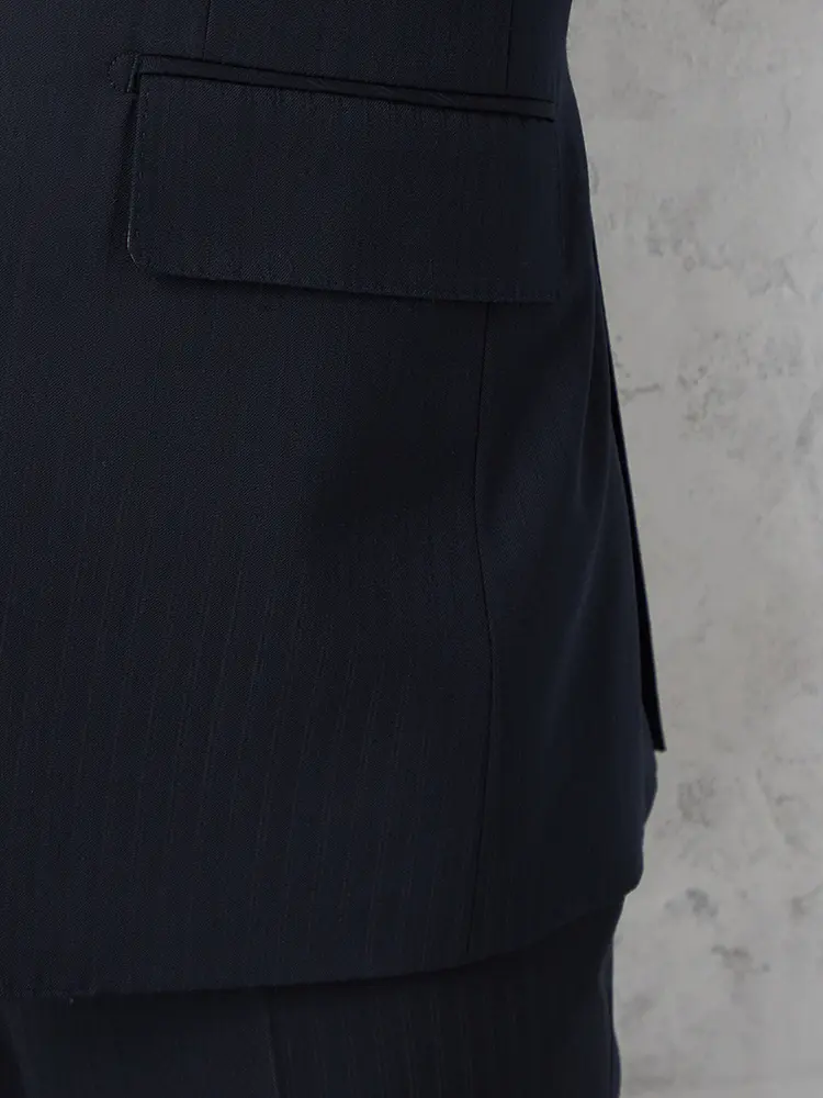 汎用性の高いストライプ柄で、背抜き仕様とサイドベンツが快適な動きと通気性を実現します。