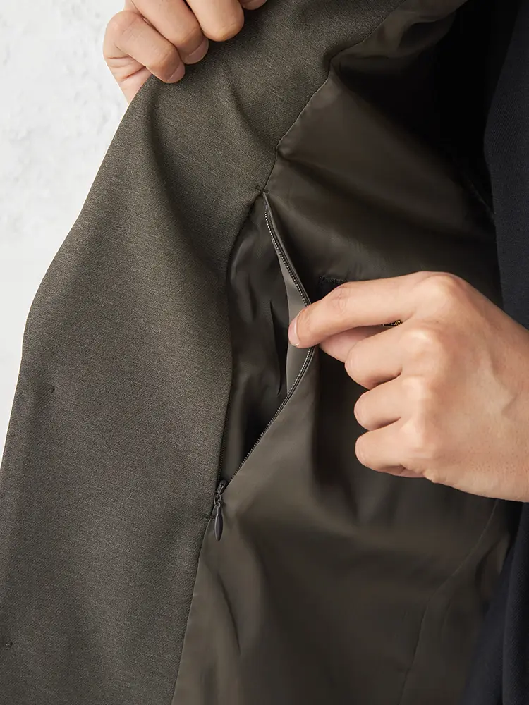ナイロン87%・ポリウレタン13%のハイストレッチ素材を使用し、軽量・形態安定・ウォッシャブル機能を完備。